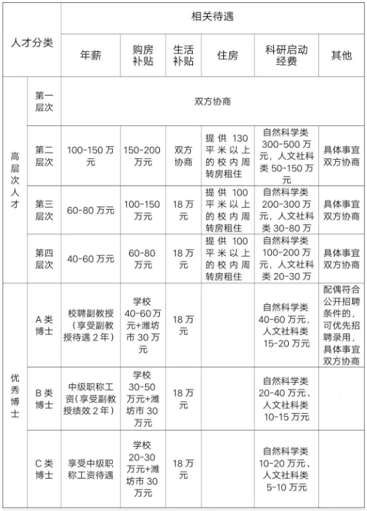 (三)引进人才待遇中的生活补贴是根据潍坊市人才政策,每月3000元,享受5年,共18万元。购房补贴中学校购房补贴为学校一次性发放(税前),潍坊市30万购房补贴具体根据潍坊市有关政策执行。