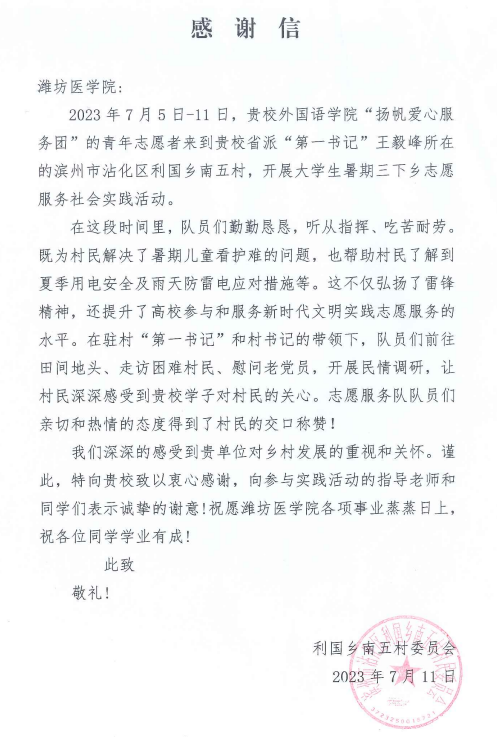 根据学校以“学习二十大 永远跟党走 奋进新征程”为主题,以学习宣传贯彻党的二十大精神为重点,以“返家乡”社会实践为思路,积极推进“百万大学生进社区”,组织引导大学生了解国情民情、提高认识和融入社会的素质能力,开展社会实践活动的总体要求,7月11日,潍坊医学院校团委书记赵建辉、偷拍论坛 院长付有龙、党总支副书记朱宏、副院长吴迪带队,偷拍论坛 大学生“扬帆爱心服务团”赴潍坊医学院“第一书记”王毅峰所在的帮包村--滨州市沾化区利国乡南五村,依托滨州团市委开展的“滨滨学堂”暑期留守儿童关爱项目,开展暑期“三下乡”社会实践活动。滨州市2023年暑期“滨滨学堂”留守儿童关爱项目启动仪式在沾化区利国乡举办,省派工作队、滨州团市委、沾化区委组织部、沾化区民政局、各乡镇(街道、海防)团(工)委书记、暑期社会实践大学生代表参加活动,赵建辉在开幕式上讲话。