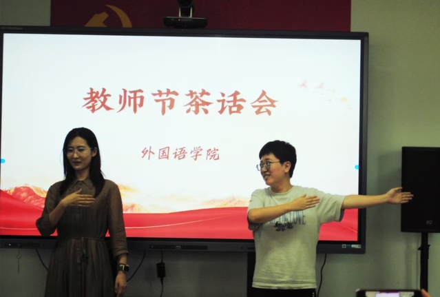 茶话会现场,英语专业2023 级老生和2024级新生精心准备了节目,为老师们带来了意外惊喜。他们自编自演,深情朗诵《礼赞吾师》“Dear teacher, you are the lighthouse in the ocean of knowledge, shining brightly and guiding our way……”,同学们用流利的英语朗诵,生动地表达了对老师们的敬爱之情。随后的女生小合唱《纪念》,悠扬的旋律传递着学生们对老师们深深的感恩与祝福。