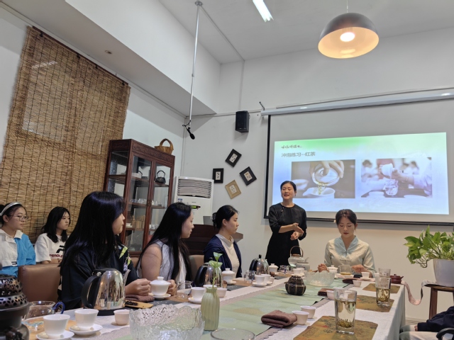 随后,茶艺表演为大家带来了一场视觉与味觉的盛宴,呈现了艺术与生活的交融。茶艺表演者配合张海燕的讲解,优雅地展示着泡茶的每一个步骤,温杯、投茶、注水、出汤,动作如行云流水,一气呵成。在茶艺师的指导下,在场老师和同学们纷纷亲自尝试《和荼九式》泡茶法,感受茶叶在水中舒展的美妙,品味茶香在唇齿间萦绕的韵味。大家在泡茶、品茶的过程中,不仅学到了冲泡技巧,更深刻体会到了茶韵之美。