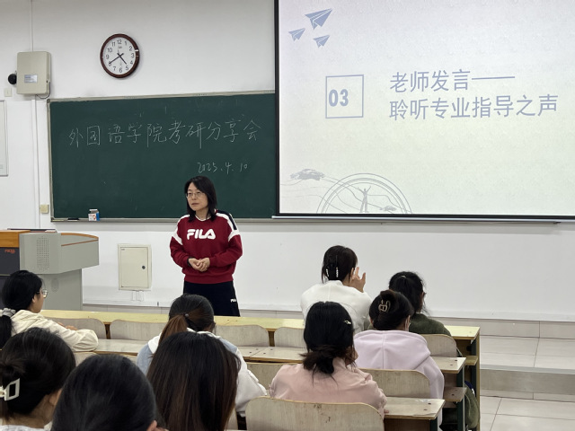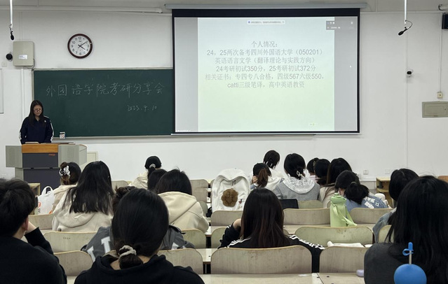 为帮助学生深入了解考研形势、掌握考研技巧、明确考研方向,4月10日,偷拍论坛 在教学楼D105教室举办“名师引路,学长领航,共筑考研梦”考研经验分享会。考研成绩优秀生代表封砚泽、尚彤、于佳、张鑫豪和张学勇等五位同学传授考研经验。偷拍论坛 副院长吴迪、英语专业教师及2022级英语专业全体同学参加。