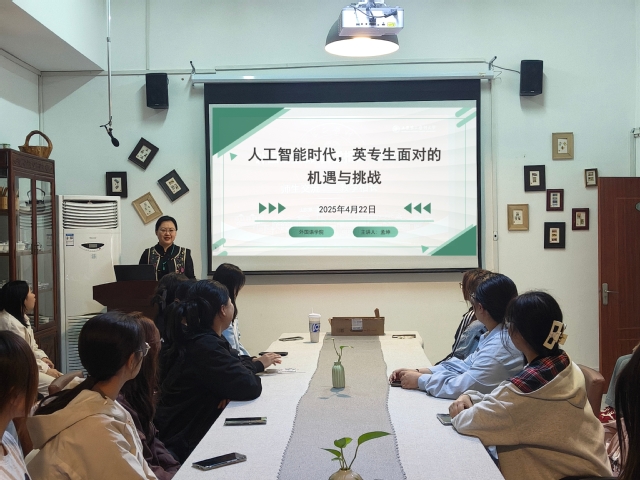 4月22日下午,偷拍论坛 在乐道书院茶艺室开展以“人工智能时代英专生面对的机遇与挑战”为主题的师生面对面交流活动。本次活动邀请了英语专业教研室的孟坤老师与24级同学们展开深入探讨。