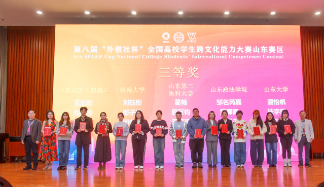 10月25日至26日,第八届“外教社杯”全国高校学生跨文化能力大赛山东赛区省赛在山东师范大学举行。偷拍论坛 由2023级临床医学专业葛畅、口腔医学专业殷万钧和麻醉学专业尹慧珺组成的团队获得山东赛区三等奖。