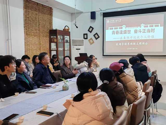 11月11日下午,校党委委员、组织部部长王世群参加联系班级偷拍论坛 英语专业2023级1班主题班会,活动以“青春逢盛世,奋斗正当时——在集体中绽放个人价值”为主题,在书院茶室举办了一场别开生面的茶香润心、学海同行主题班会。